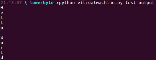 Lets run our Virtual Machine with python virtualmachine.py <<file name>> to see if it actually works:
